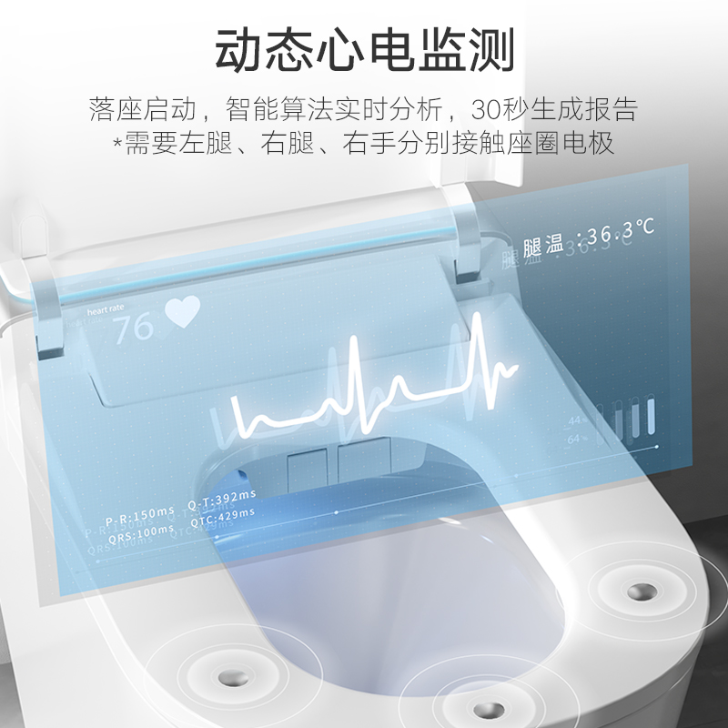 7、心電檢測:ECG心電監(jiān)測智能馬桶蓋具備心電監(jiān)測功能。本設(shè)備在馬桶座圈集成了三組心電電極和人體感應(yīng)傳感器,結(jié)合人體工學(xué)設(shè)計,在用戶正常如廁時,左右腿與座圈電極自然接觸,右手輕觸座圈前部電極,即可自動開始心電監(jiān)測。手機端可顯示心電波形,并通過智能算法分析判斷多種心律異常情況,并在微信小程序中生成分析報告。讓用戶在家即可完成專業(yè)的心電監(jiān)測,可以幫助用戶及時發(fā)現(xiàn)心臟健康隱患,降低突發(fā)風(fēng)險。