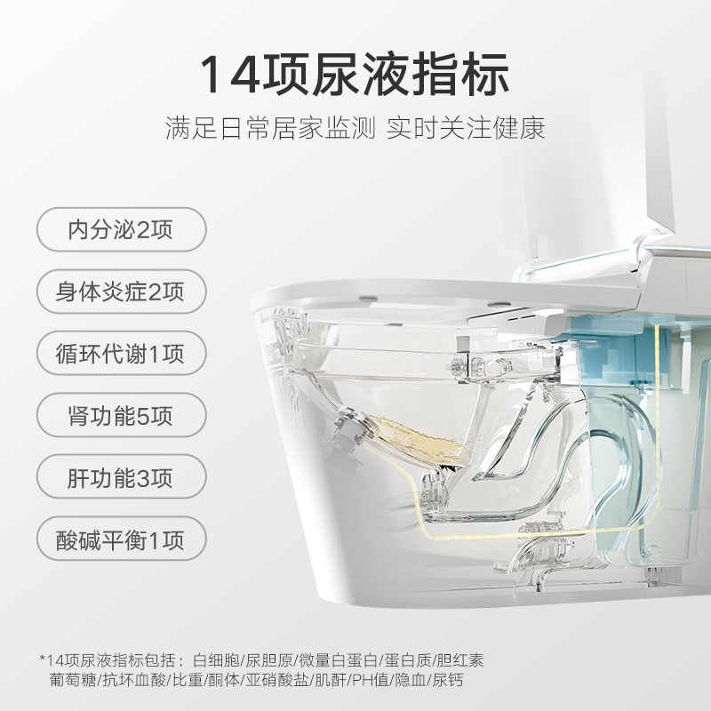 2、簡單便捷:可以在正常如廁時,開啟尿常規(guī)檢測。通過試紙盒檢測分析后即可完成常規(guī)尿檢,自動獲取人體的蛋白質(zhì)、微量白蛋白、尿比重等14項尿液數(shù)據(jù)并生成檢測報告。(注:尿常規(guī)十四項包括白細胞、尿膽原、微量白蛋白、蛋白質(zhì)、膽紅素、葡萄糖、抗壞血酸、比重、酮體、亞硝酸鹽、肌酐、pH值、隱血、尿鈣)